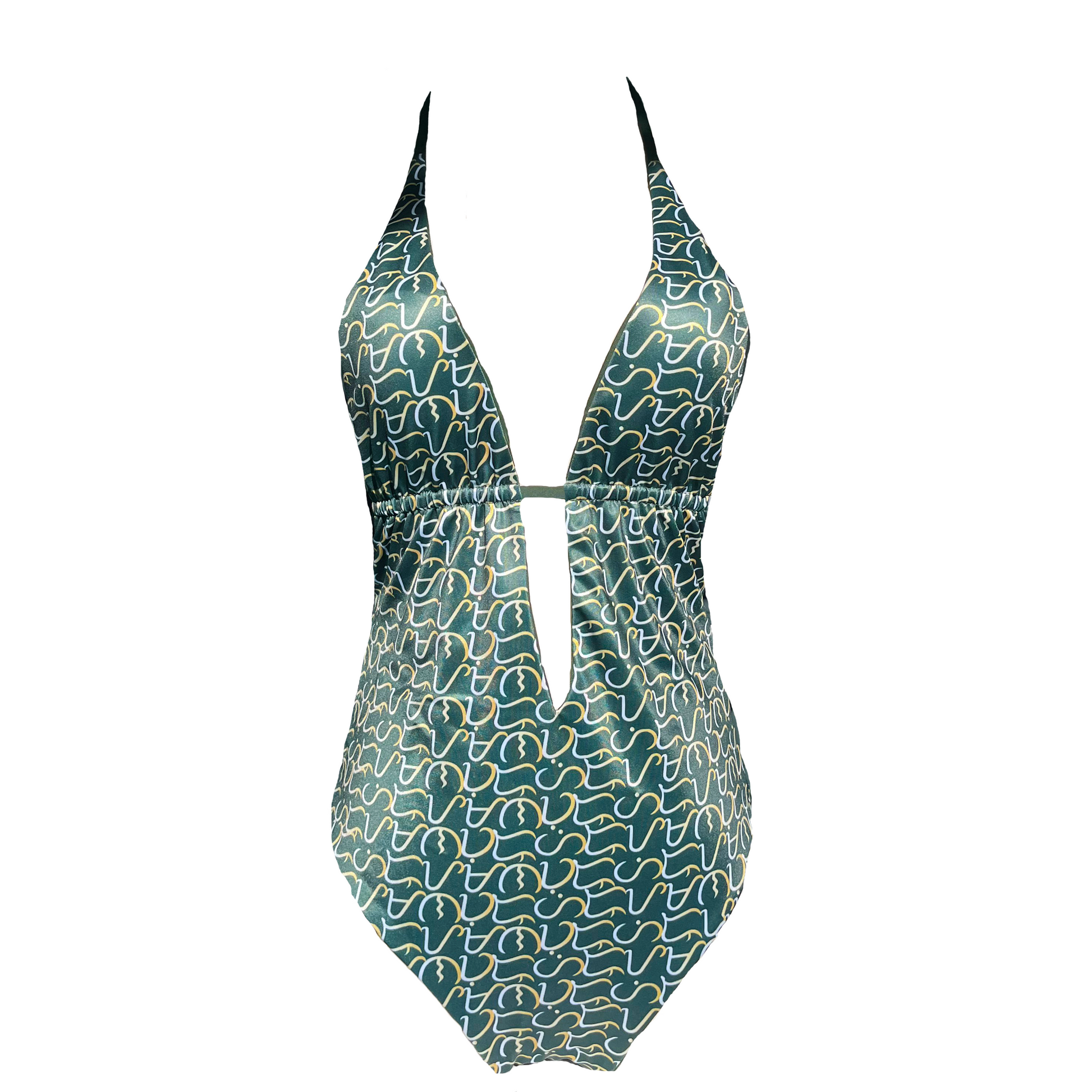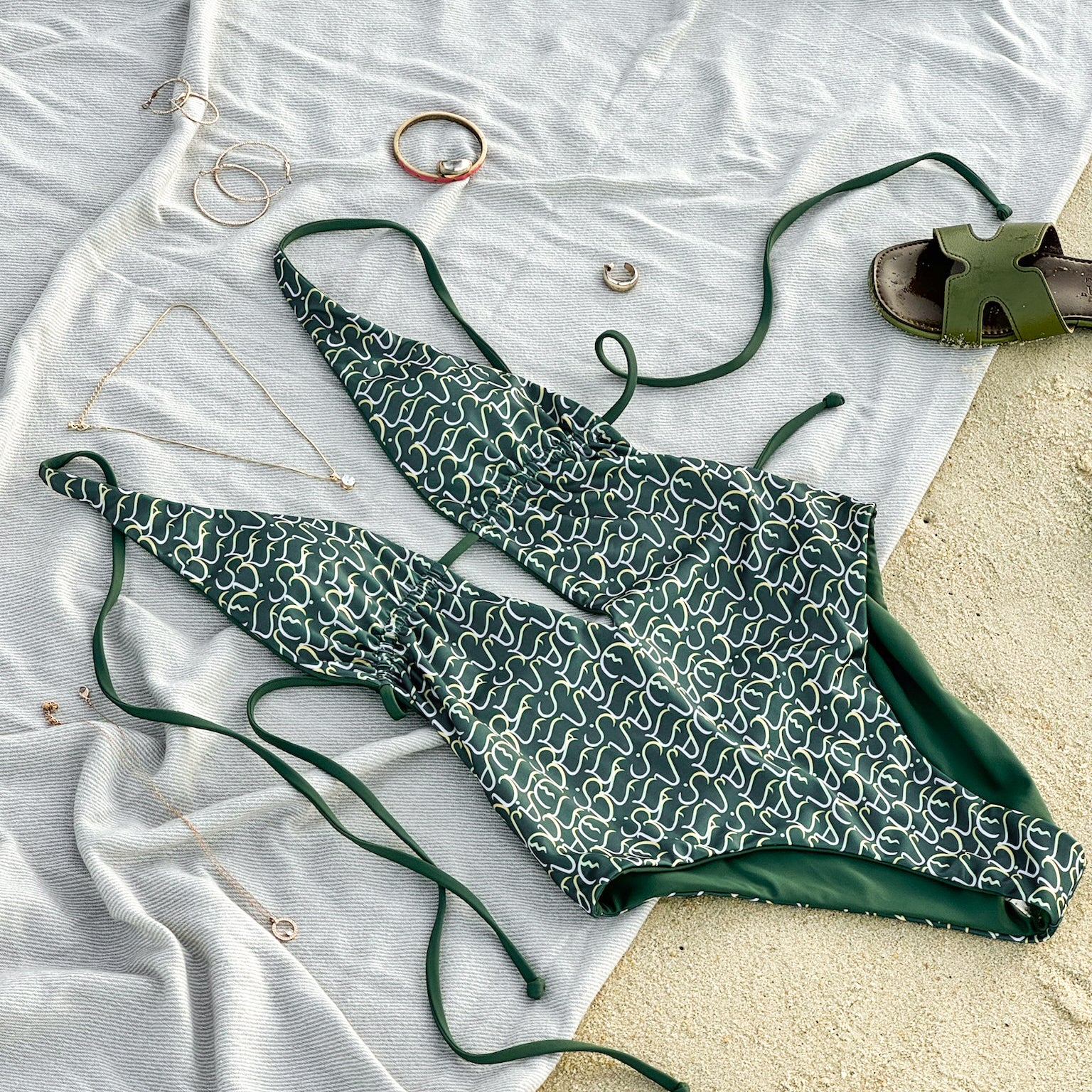 Introducing the Saldañas One Piece in Pretender Green! Showcasing signature prints on one side, this reversible swimsuit exudes elegance with its low back design and offers a personalized fit with halter ties and adjustable underbust. Elevate your swimwear collection with this chic and comfortable ensemble.